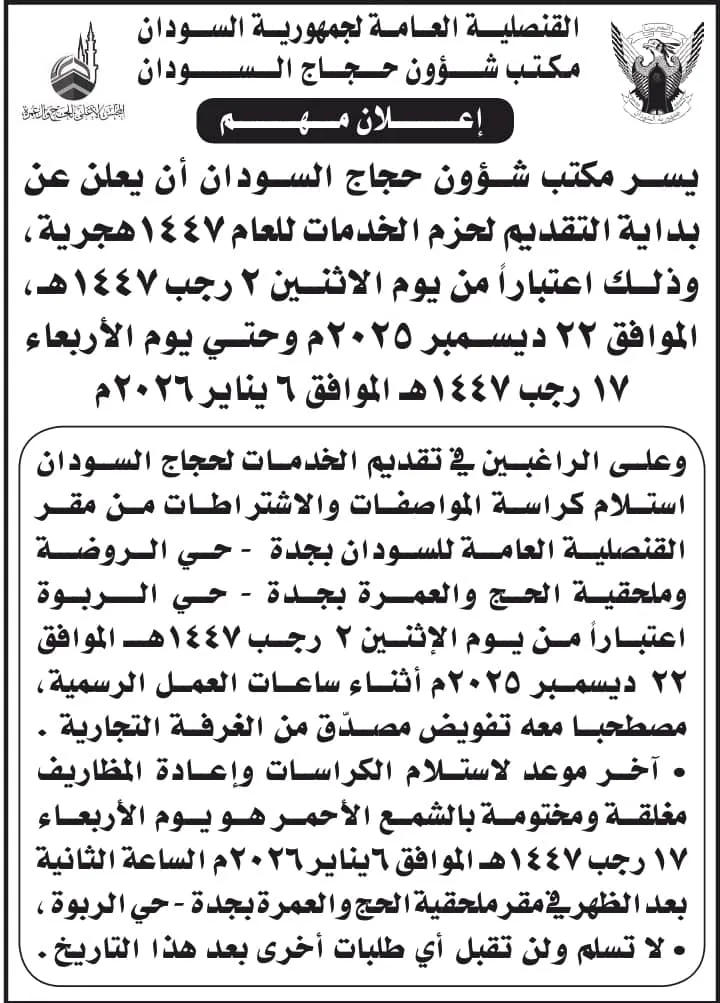 > “يسر مكتب شؤون حجاج السودان أن يعلن عن بداية التقديم لحزم الخدمات للعام ١٤٤٧ هجرية، وذلك اعتباراً من يوم الاثنين ٢ رجب ١٤٤٧هـ، الموافق ٢٢ ديسمبر ٢٠٢٥م وحتى يوم الأربعاء ١٧ رجب ١٤٤٧هـ الموافق ٦ يناير ٢٠٢٦م.”