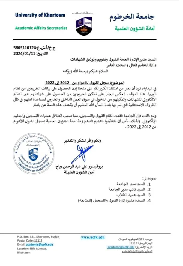 ثانيًا: دعم فني موثق يدحض ادعاءات الاختراق: بناءً على طلب رسمي مكتوب، قامت الوزارة بتزويد أمين الشؤون العلمية بجامعة الخرطوم بنسخ كاملة من بيانات الطلاب والخريجين لضمان استمرارية عمل أمانة الشؤون العلمية (مرفق صورة من الخطاب)، وتؤكد الوزارة أنها تقوم بحماية البيانات وفق آليات تأمين ذات موثوقية عالية ولا تتعامل مع أي جهات خارج الأطر الرسمية، الأمر الذي ينفي تمامًا الادعاء بحدوث “اختراق” لبيانات الطلاب (المقبولين والخريجين) من خلال الوزارة. وفي الوقت الذي رفض فيه أمين الشؤون العلمية المستقيل إيداع شهادات تفاصيل خريجي الجامعة في قاعدة البيانات المركزية قبل الحرب بدعوى “الاستقلالية”، الأمر الذي انعكس سلبا على استخراج شهادات التفاصيل بعد اندلاع الحرب، وهذا ما يؤكد عدم صحة طرحه الذي ألحق ضررًا مباشرًا بمصلحة الطلاب والخريجين. ويجدر التنويه إلى أن ذات “الاستقلالية” قد تنازل عنها بطلبه لتزويد الجامعة ببيانات المقبولين والخريجين من الوزارة، وهو ما أتاح استئناف العمل وفتح نافذة استخراج الشهادات العامة بالجامعة.