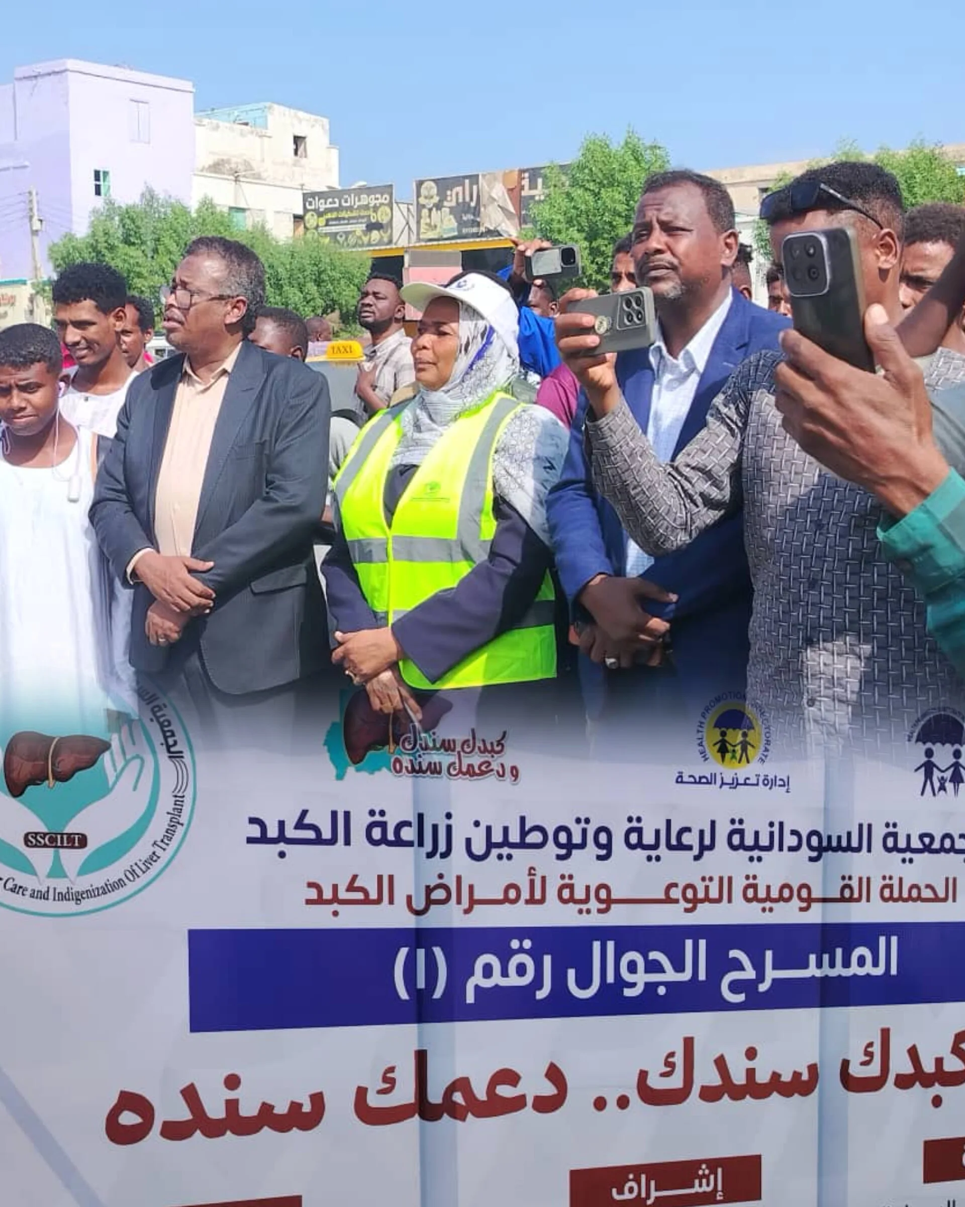 دشنت الجمعيه القوميه لرعاية وتوطين وزراعة الكبد الحمله التوعويه والمسرح الجوال وسط جمع كبير من المواطنين بحاضرة ولايه البحر الأحمر بورتسودان في السوق الكبير جاء هذا اللقاء بهدف التوعيه ومكافحة المخاطر التي لايدركها المواطن هذا البرنامج نظمته الجمعيه التوعويه بالتعاون مع وزارة الصحه البحر الأحمر بتشريف نائب رئيس مجلس السيادة الفريق مالك عقار اير تحت شعار كبدك…. سندك