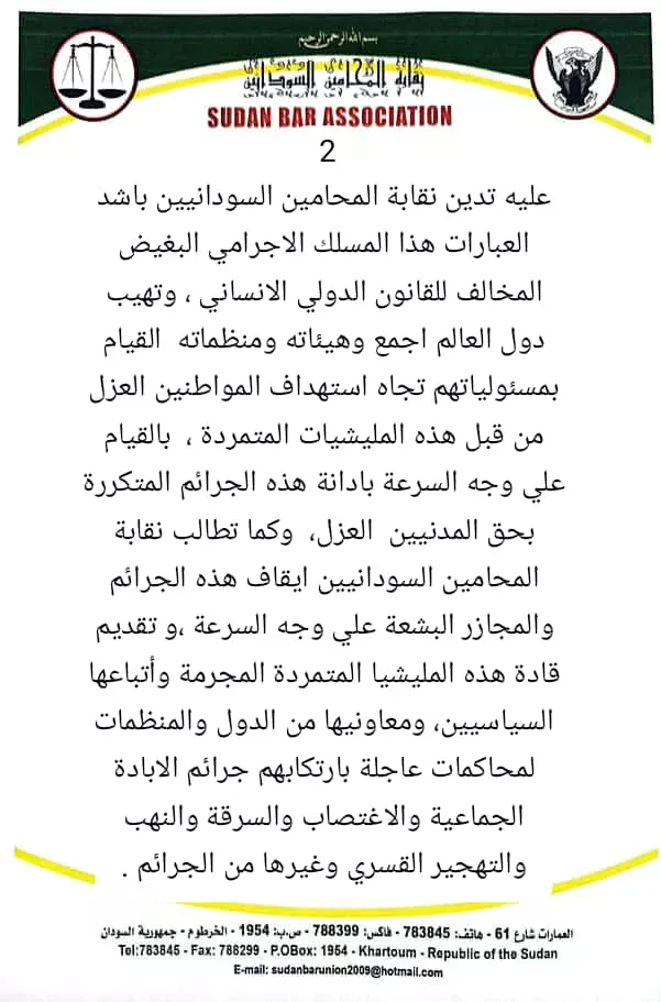 عليه تدين نقابة المحامين السودانيين باشد العبارات هذا المسلك الاجرامي البغيض المخالف للقانون الدولي الانساني ، وتهيب دول العالم اجمع وهيئاته ومنظماته القيام بمسئولياتهم تجاه استهداف المواطنين العزل من قبل هذه المليشيات المتمردة ، بالقيام علي وجه السرعة بادانة هذه الجرائم المتكررة بحق المدنيين العزل، وكما تطالب نقابة المحامين السودانيين ايقاف هذه الجرائم والمجازر البشعة علي وجه السرعة ،و تقديم قادة هذه المليشيا المتمردة المجرمة وأتباعها السياسيين، ومعاونيها من الدول والمنظمات لمحاكمات عاجلة بارتكابهم جرائم الابادة الجماعية والاغتصاب والسرقة والنهب والتهجير القسري وغيرها من الجرائم .