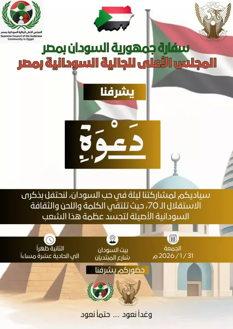 - الجالية السودانية بمصر تحتفل بالذكرى السبعين لاستقلال السودان تحت شعار “وغداً نعود… حتماً نعود”
