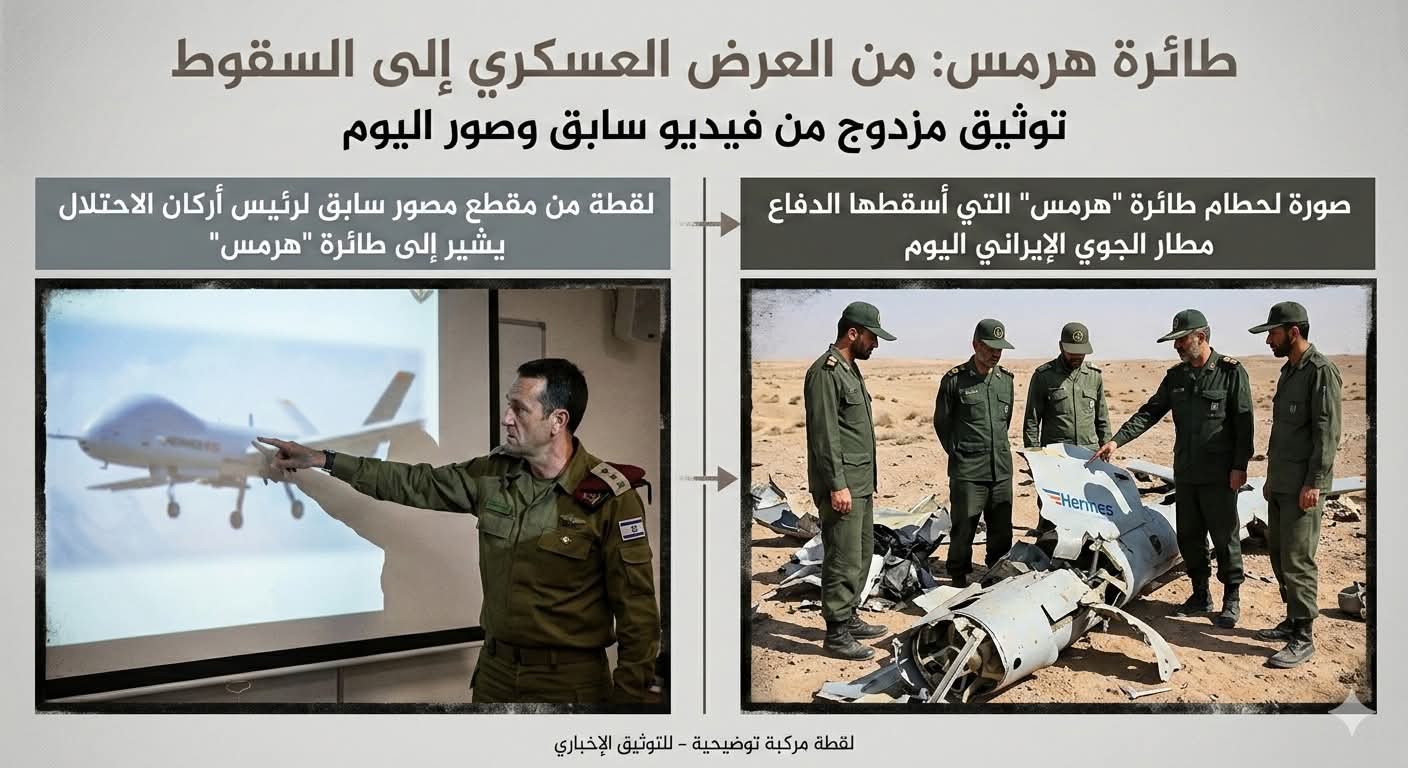 ​في مشهد يعكس تهاوي التوقعات العسكرية، نجحت قوات الدفاع الجوي الإيراني في إسقاط طائرة مسيرة من طراز “هرمس”، وهي العملية التي كشفت عن مفارقة مدوية؛ حيث تبين أن حطام هذه الطائرة الذي استقر اليوم في أراضي إيران، هو ذاته النموذج الذي كان يُستعرض به “رئيس أركان الاحتلال” في مقاطع ترويجية سابقة.