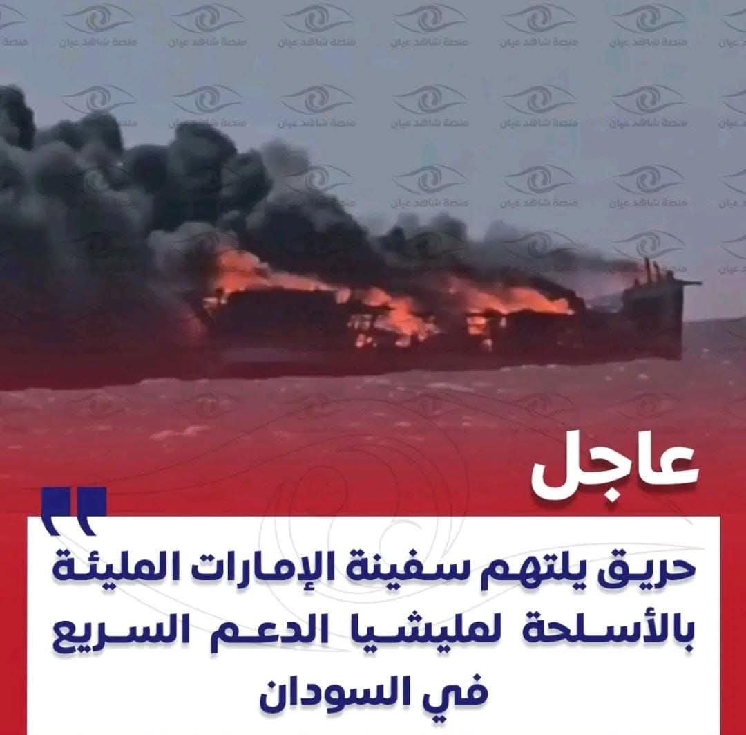عاجل | حريق يلتهم سفينة #الإمارات المليئة بالأسلحة لمليشيا الدعم السريع في السودان