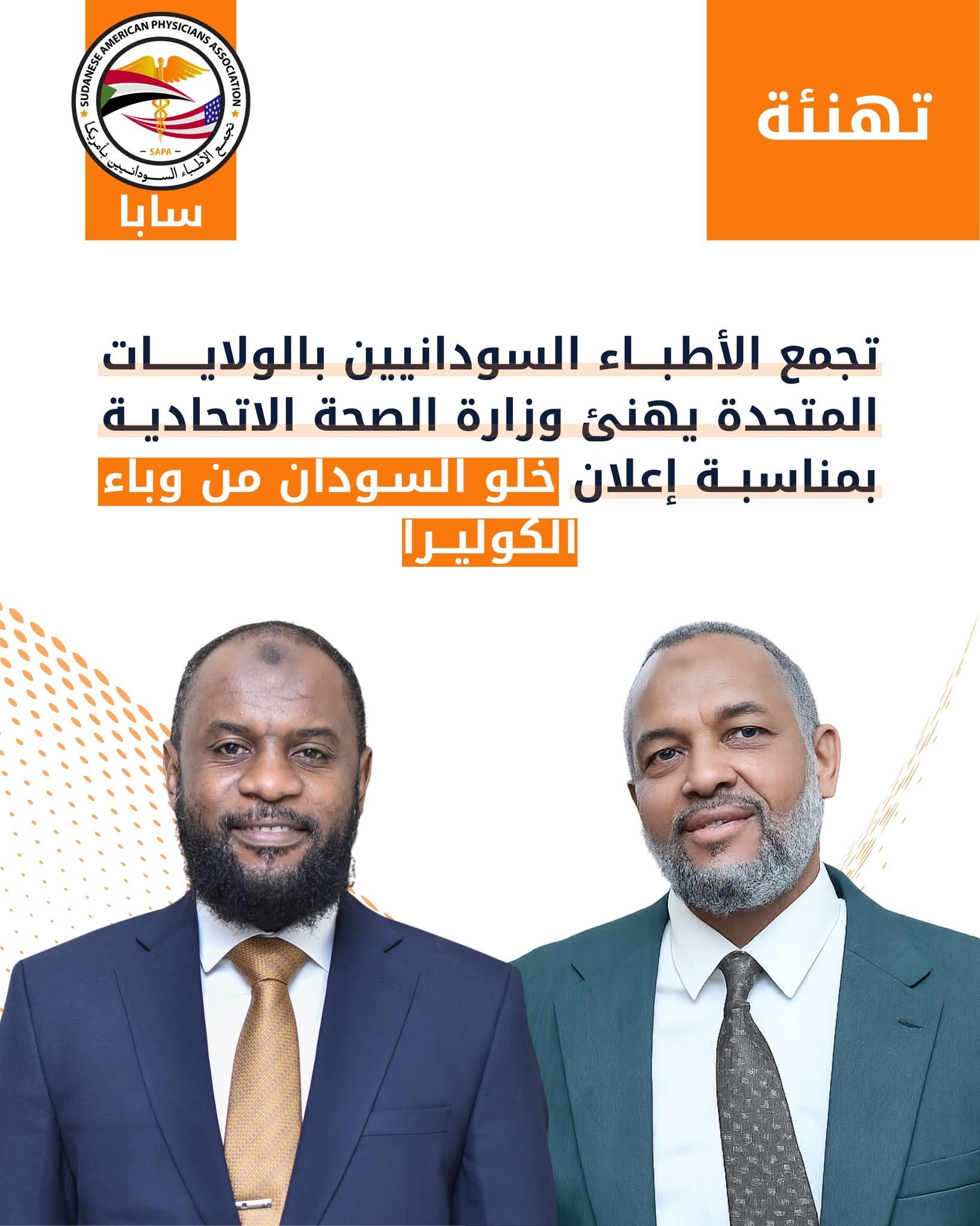 يتقدّم تجمع الأطباء السودانيين بالولايات المتحدة الأمريكية (SAPA) بخالص التهاني إلى وزارة الصحة الاتحادية ووزير الصحة الاتحادي البروفيسور هيثم محمد إبراهيم بمناسبة إعلان خلو السودان من وباء الكوليرا، وهو إنجاز صحي مهم تحقق رغم الظروف الاستثنائية والتحديات الكبيرة التي تمر بها البلاد.