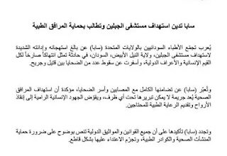 سابا تدين إستهداف مستشفى الجبلين وتدعو إلى الالتزام بتحييد المرافق الطبية والمدنيين عن دائرة الحرب الخرطوم :…